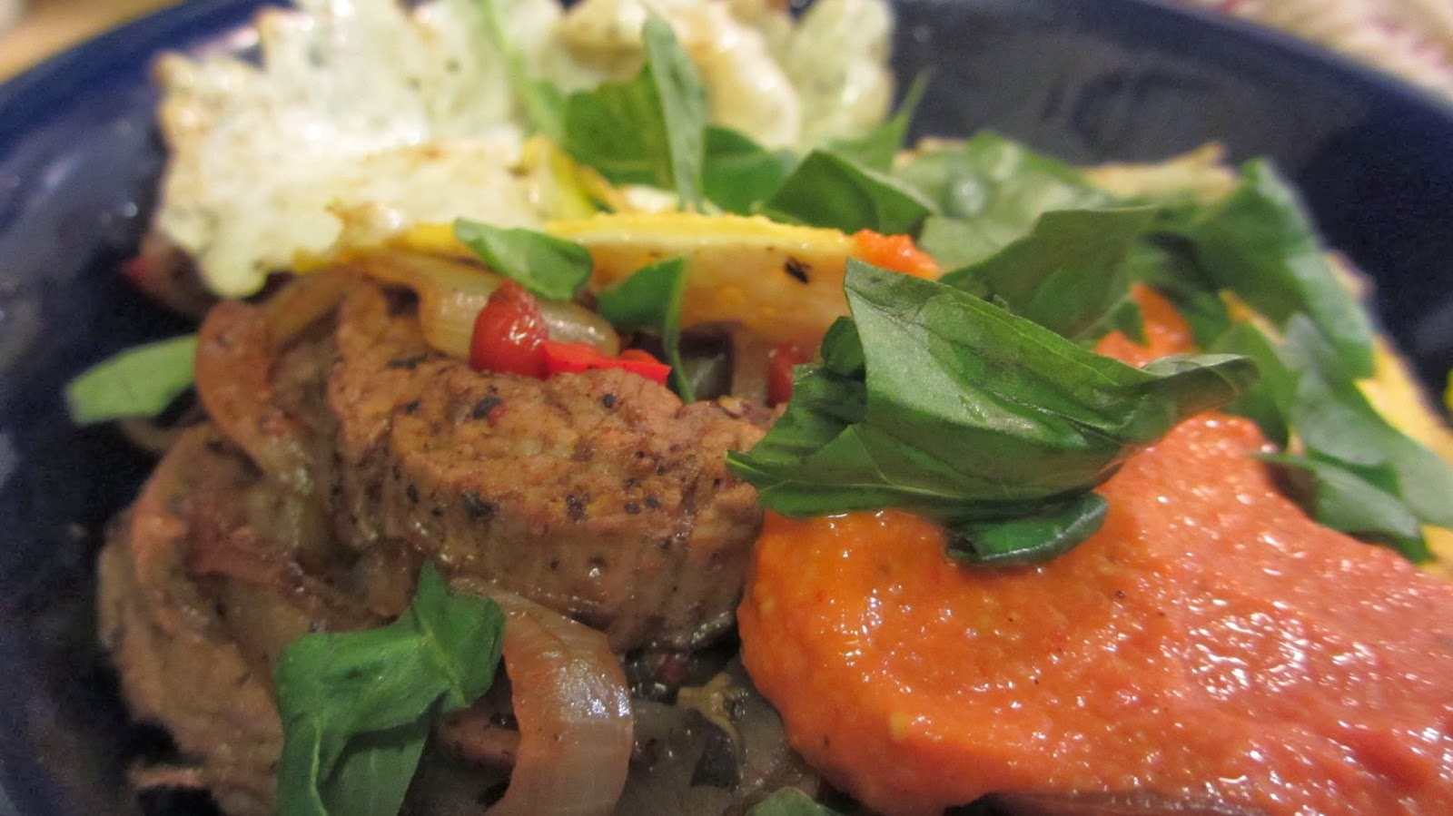 8. Cook eggs to preference and serve on top of hash along with fresh chopped basil and dollop of red pepper spread.